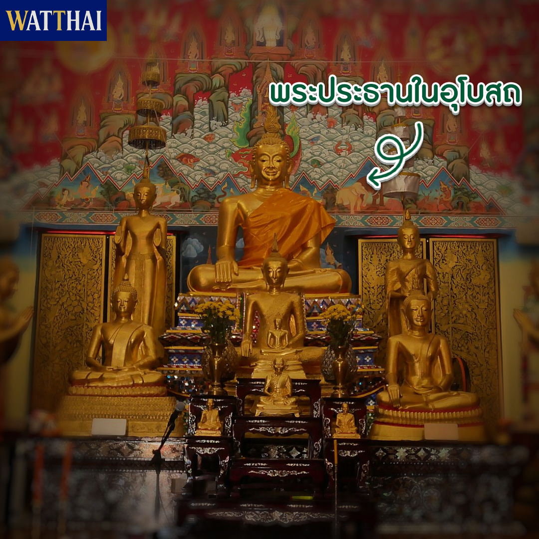 - อุโบสถหลังใหม่ มีหน้าบันประดับด้วยถ้วยชามสังคโลก ด้านในประดิษฐานพระพุทธรูปโบราณเนื้อทองเหลือง ปางห้ามญาติและปางอุ้มบาตรเรียงอยู่ด้านหลัง ส่วนแถวหน้ามีพระพุทธรูปปางมารวิชัย 3 องค์ ส่วนพระประธานเป็นพระปูนปั้นลงรักปิดทองอย่างสวยงาม ได้รับการบูรณปฏิสังขรณ์เมื่อปี พ.ศ. 2535 โดยพระครูเกษมธรรมาภินันท์
